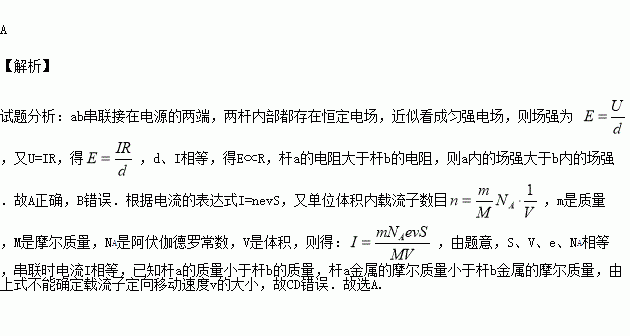 两根不同金属导体制成的长度相等、横截面积相同的圆柱形杆,串联后接在某一直流电源两端,如图所示。已知杆a的质量小于杆b的质量,杆a金属的摩尔质量小于杆b金属的摩尔质量,杆a的电阻大于杆b的电阻,假设每种金属的每个原子都提供相同数目的自由电子(载流子)。当电流达到稳恒时,若a、 b内均存在电场,则该电场可视为均匀电场。下面结论中正确的是 ( )