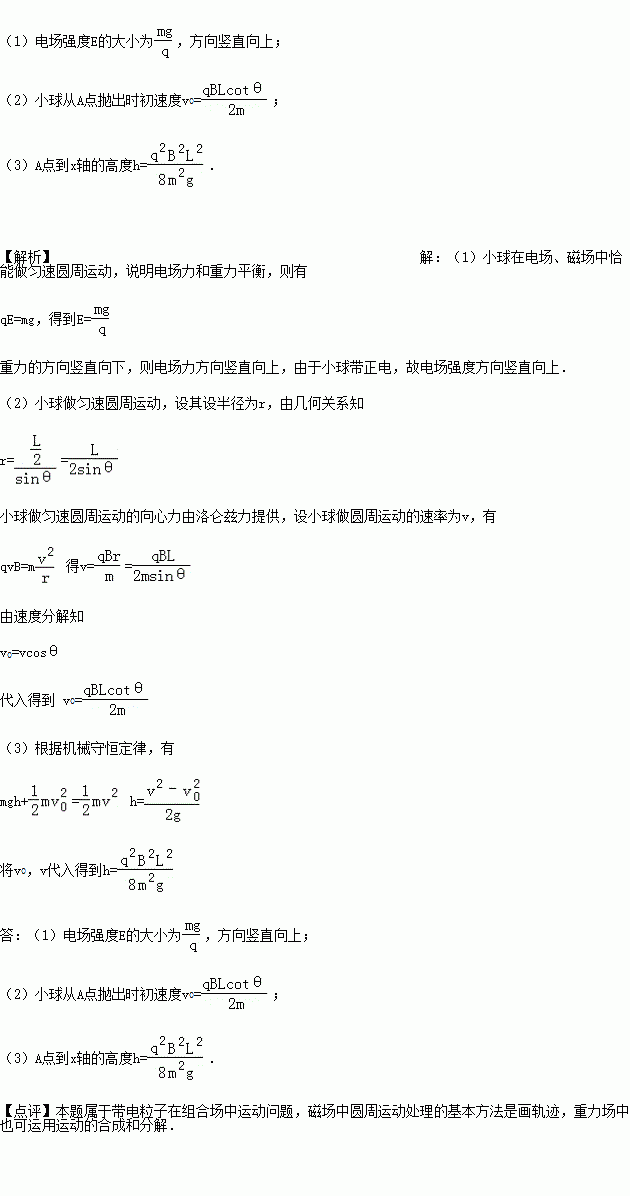 如图所示,直角坐标系xOy位于竖直平面内,在水平的x轴下方存在匀强磁场和匀强电场,磁场的磁感应为B,方向垂直xOy平面向里,电场线平行于y轴.一质量为m、电荷量为q的带正电的小球,从y轴上的A点水平向右抛出,经x轴上的M点进入电场和磁场,恰能做匀速圆周运动,从x轴上的N点第一次离开电场和磁场,MN之间的距离为L,小球过M点时的速度方向与x轴的方向夹角为θ.不计空气阻力,重力加速度为g,求