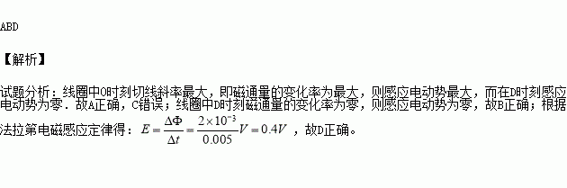 某线圈所围面积里磁通量随时间变化的规律是正弦曲线,如图所示,D时刻的磁通量最大,则下列说法正确的是( )