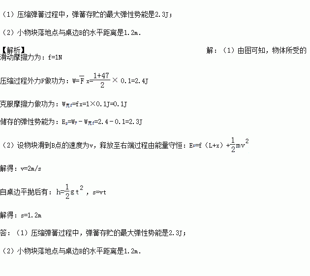 如图1所示,一根轻质弹簧左端固定在水平桌面上,右端放一个可视为质点的小物块,小物块的质量为m=1.0kg,当弹簧处于原长时,小物块静止于O点,现对小物块施加一个外力,使它缓慢移动,压缩弹簧x=0.1m至A点,在这一过程中,所用外力与弹簧压缩量的关系如图2所示.然后释放小物块,让小物块沿桌面运动,已知O点至桌边B点的距离为L=0.2m.水平桌面的高为h=1.8m,计算时,可取滑动摩擦力近似等于最大静摩擦力.(g取10m/s2)