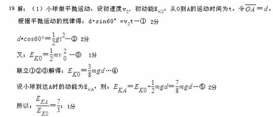 如图,O、A、B为同一竖直平面内的三个点,OB沿竖直方向,∠BOA=60°,重力加速度大小为g,将一质量为m的小球以一定的初动能自O点水平向右抛出,小球在运动过程中恰好通过A点,求:小球到达A点时的动能与初动能的比值;