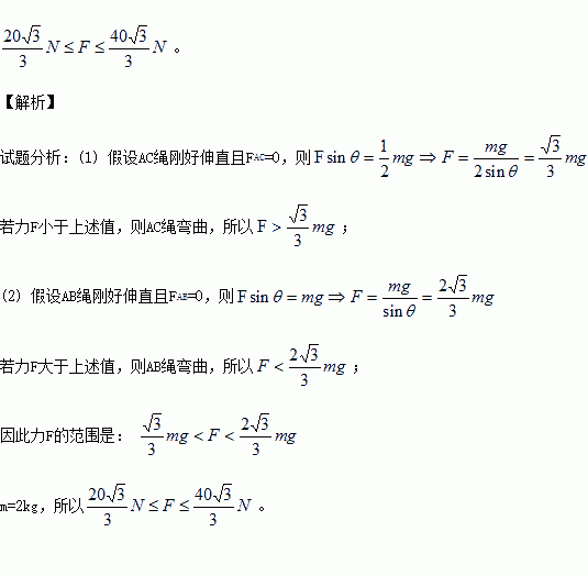 如图所示,物体的质量为2kg,两根轻细绳AB和AC一端连接于竖直墙上,另一端系于物体上,在物体上另施加一个方向与水平成θ=60°的拉力,若要使绳都能伸直,求拉力F的大小范围?(取g=10 m/s2)