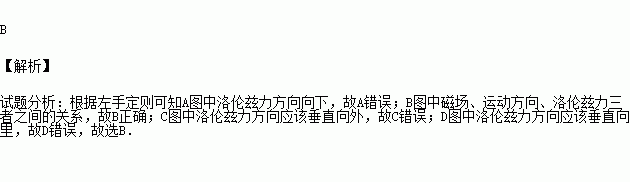 在图所示的四个图中,标出了匀强磁场的磁感应强度B的方向、带正电的粒子在磁场中速度v的方向和其所受洛伦兹力f的方向,其中正确表示这三个方向关系的图是( )