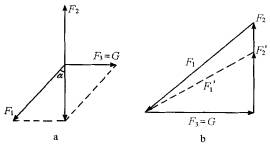 ¡¡¡¡È¡¸ËµÄÉ϶˵ãAΪÑо¿¶ÔÏóÊÜÁ¦ÈçͼaËùʾ£¬ACÉþµÄÀÁ¦F1£¬¸ËµÄÖ§³ÖÁ¦F2£¬Ë®Æ½ÉþµÄÀÁ¦F3=G£¬½«F1ÓëF3Óúϳɷ¨ºÏ³ÉÈçͼaËùʾ£¬ÉèACÏßÓëAB¼Ð½ÇΪaÔò