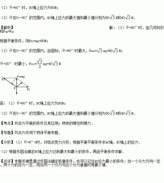 (2)θ在0~90°的范围内,物体平衡时BC绳上拉力的最大值和最小值.