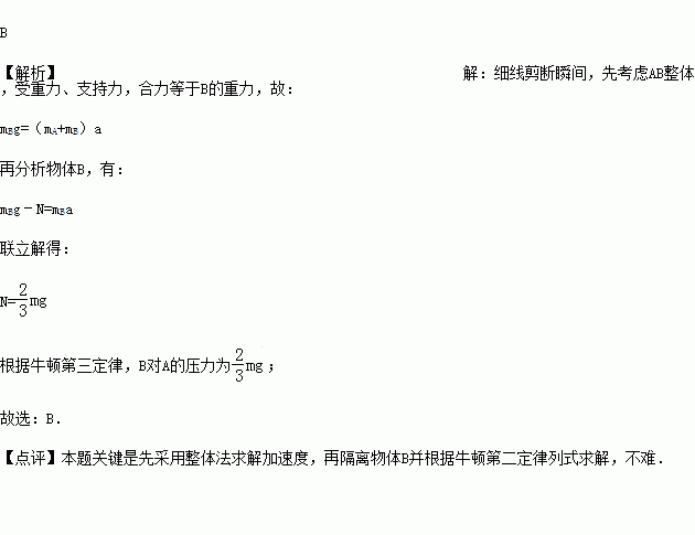 如图所示,物体A、B质量分别为m和2m.物体A静止在竖直的轻弹簧上面,物体B用细线悬挂起来,A、B紧挨在一起但A、B之间无压力,已知重力加速度为g.某时刻将细线剪断,则细线剪断瞬间,B对A的压力大小为( )