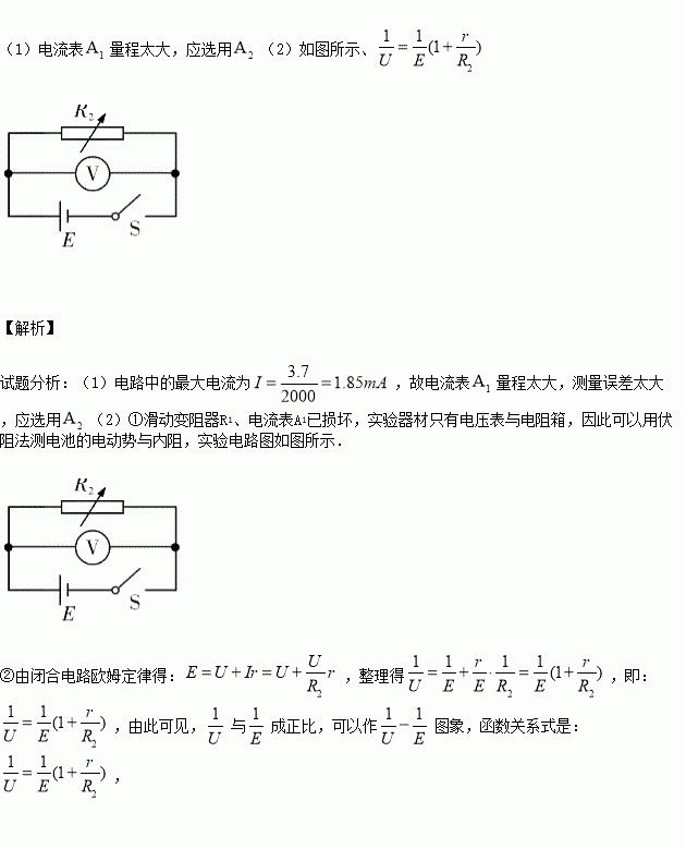 (2)在实际操作过程中,发现滑动变阻器R1、电流表A1已损坏,请用余下的器材测量锂电池的电动势E和内阻r。