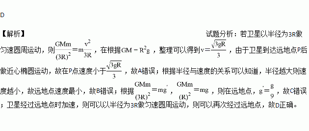 2015年12月10日,我国成功将中星1C卫星发射升空,卫星顺利进入预定转移轨道。如图所示为该卫星沿椭圆轨道绕地球运动的示意图,已知地球半径为R,地球表面重力加速度g,卫星远地点P距地心O的距离为3R,则( )
