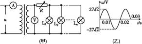 如图(甲)所示,理想变压器原、副线圈的匝数之比n1∶n2=3∶1,原线圈电路中接有一量程为3 A的理想交流电流表,副线圈两端接有理想交流电压表一只和可变电阻R以及若干“6 V、6 W”的相同灯泡.输入端交变电压u的图像如图(乙)所示.