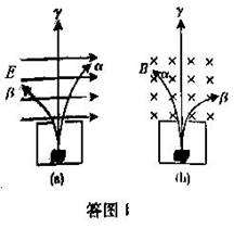 如图所示,铅盒内装有能释放α、β和γ射线的放射性物质,在靠近铅盒的顶部加上电场E或磁场B,在图(a)、(b)中分别画出射线运动轨迹的示意图。(在所画的轨迹上须标明是α、β和γ中的哪种射线)
