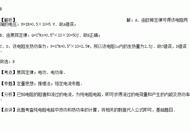 A.该电阻两端的电压是10V B.该电阻20s内的发热量为50J