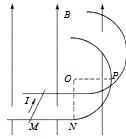 如图所示,光滑的金属轨道分为水平段和圆弧段两部分,O点为圆弧的圆心,N为轨道交点。两轨道之间宽度为0.5m,匀强磁场方向竖直向上,大小为0.5T。质量为0.05kg的金属细杆置于轨道上的M点。当在金属细杆内通以电流强度为2A的恒定电流时,其可以沿轨道由静止开始向右运动。已知MN=OP=1.0m,金属杆始终垂直轨道,OP沿水平方向,则( )