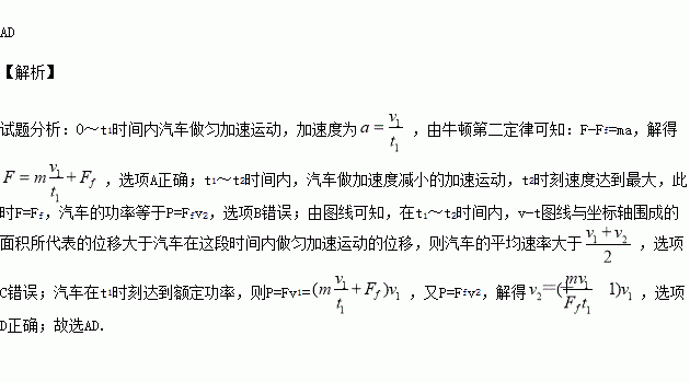 A.0~t1时间内,汽车牵引力的数值为m+ Ff
