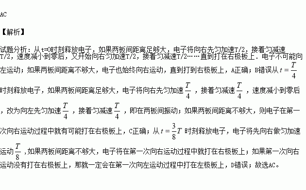 C.从t=T/4时刻释放电子,电子可能在两板间振动,也可能打到右极板上
