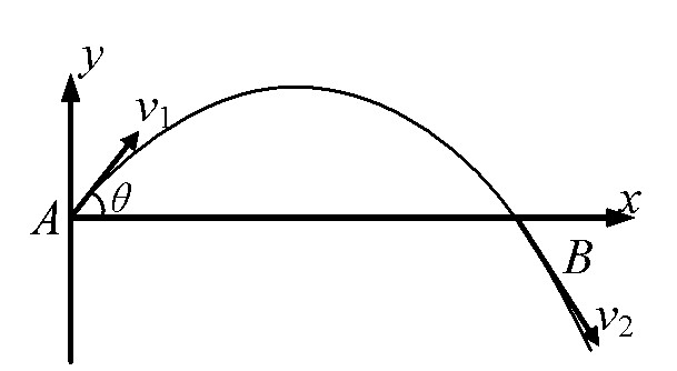 考察飞机模拟无阻力作用下的斜抛运动.设开始试验时飞机的初速度大小为v1,方向与水平方向成θ角,起始位置为A点,经做抛物线运动在B点退出试验,如图所示.以t表示试验经历的时间,在退出试验时的速率为v2,则有