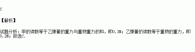 如图所示,两个同样的弹簧秤每个自重都是0.1N,下端挂钩的重力忽略不计,甲“正挂”,“乙”倒挂,在乙的下方挂上重0.2N的砝码,则甲、乙两弹簧秤的示数分别为 ( )