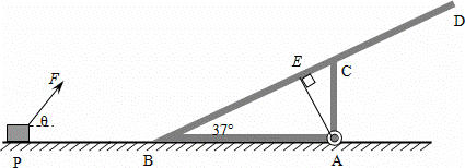 如图所示,水平地面上有一质量不计的支架ABCD,BD面光滑,倾角为37°,支架可绕固定转轴A无摩擦自由转动,CA⊥AB,BC=CD=0.75m.在距离支架底端B为PB=3m处的P点有一静止物块,质量为m=2kg,现对物块施加一个与水平方向成θ=53°的恒力F,物块向右开始做加速运动,当物块到达支架底端B后恰好可以沿支架向上匀速运动,己知物体与水平地面间的动摩擦因数μ=0.45,不计空气阻力和转折点B处能量损失.(取g=10m/s2,sin37°=0.6,sin53°=0.8)求:
