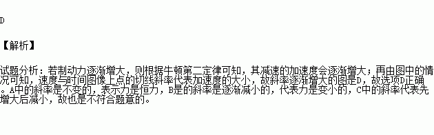 如图是空中轨道列车(简称空轨)悬挂式单轨交通系统,无人驾驶空轨行程由计算机自动控制。在某次研究制动效果的试验中,计算机观测到制动力逐渐增大,下列各图中能反映其速度v随时间t变化关系的是