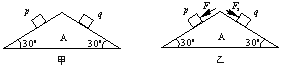 如图甲所示,在粗糙水平面上静置一个截面为等腰三角形的斜劈A,其质量为M,两个底角均为300.两个完全相同的、质量均为m的小物块p和q 恰好能沿两侧面匀速下滑.若现在对两小物块同时各施加一个平行于斜劈侧面的恒力F1、F2,且F1>F2,如图乙所示,则在p和q下滑的过程中,下列说法正确的是( )
