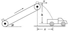 ÈçͼËùʾ£¬ÊÇÀûÓõçÁ¦´«ËÍ´ø×°ÔËÂé´ü°üµÄʾÒâͼ¡£´«ËÍ´ø³¤l£½20 m£¬Çã½Ç¦È£½37¡ã£¬Âé´ü°üÓë´«ËÍ´ø¼äµÄ¶¯Ä¦²ÁÒòÊý¦Ì£½0.8£¬´«ËÍ´øµÄÖ÷¶¯ÂֺʹӶ¯ÂÖ°ë¾¶RÏàµÈ£¬´«ËÍ´ø²»´ò»¬£¬Ö÷¶¯ÂÖ¶¥¶ËÓë»õ³µµ×°å¼äµÄ¸ß¶È²îΪh£½1.8 m£¬´«ËÍ´øÔÈËÙÔ˶¯µÄËÙ¶ÈΪv£½2 m/s¡£ÏÖÔÚ´«ËÍ´øµ×¶Ë (´«ËÍ´øÓë´Ó¶¯ÂÖÏàÇÐλÖÃ)Óɾ²Ö¹ÊÍ·ÅÒ»Ö»Âé´ü°ü(¿ÉÊÓΪÖʵã)£¬ÆäÖÊÁ¿Îª100 kg£¬Âé´ü°ü×îÖÕÓë´«ËÍ´øÒ»Æð×öÔÈËÙÔ˶¯£¬µ½´ïÖ÷¶¯ÂÖÊ±ËæÂÖÒ»ÆðÔÈËÙת¶¯¡£Èç¹ûÂé´ü°üµ½´ïÖ÷¶¯ÂÖµÄ×î¸ßµãʱ£¬Ç¡ºÃˮƽÅ׳ö²¢ÂäÔÚ³µÏäµ×°åÖÐÐÄ£¬ÖØÁ¦¼ÓËÙ¶Èg£½10 m/s2£¬sin 37¡ã£½0.6£¬cos 37¡ã£½0.8£¬Çó£º