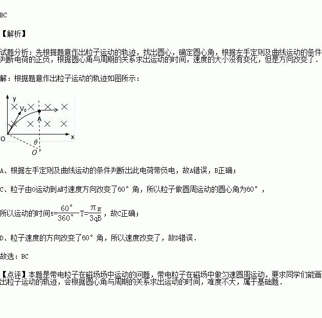 如图,磁感强度为B的匀强磁场,垂直穿过平面直角坐标系的第I象限.一质量为m,带电量为q的粒子以速度V从O点沿着与y轴夹角为30°方向进入磁场,运动到A点时的速度方向平行于x轴,那么( )