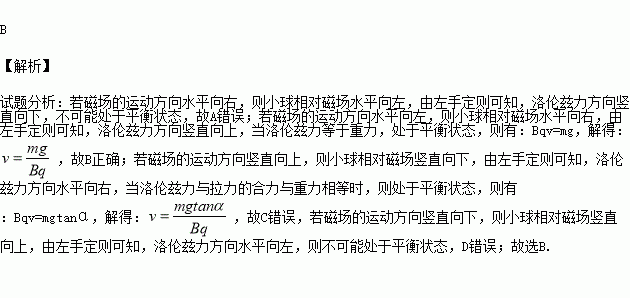 用绝缘细线悬挂一个质量为m,带电荷量为+q的小球,让它处于如图所示的磁感应强度为B的匀强磁场中.由于磁场的运动,小球静止在如图位置,这时悬线与竖直方向夹角为α,并被拉紧,则磁场的运动速度大小和方向可能是 ( )