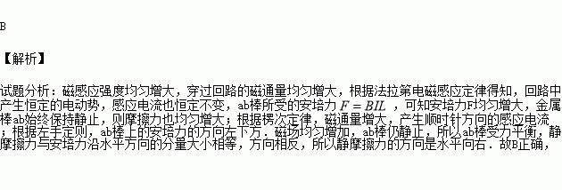 如图所示,金属棒ab置于水平放置的金属导体框架cdef上,棒ab与框架接触良好,从某一时刻开始,给这个空间施加一个斜向上的匀强磁场,并且磁场均匀增加,ab棒仍能保持静止,则在磁场均匀增加的过程中,关于ab棒受到的摩擦力,下列说法正确的是