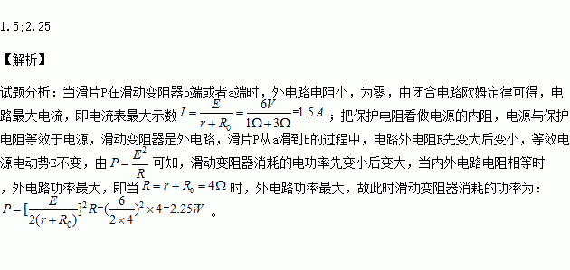 在如图所示电路中,电源电动势E=6V,内阻r=1Ω,保护电阻R0=3Ω,滑动变阻器总电阻R=20Ω,闭合电键S,在滑片P从a滑到b的过程中,电流表的最大示数为________A,滑动变阻器消耗的最大功率为________W。