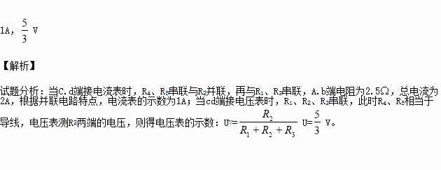 如右下图所示电路中电阻R1、R2和R3的阻值都是1Ω,R4和R5的阻值都是0.5Ω,A.b端输入电压为5V。当C.d端接电流表时,其示数为_______A;当C.d端接电压表时,其示数为_______V。