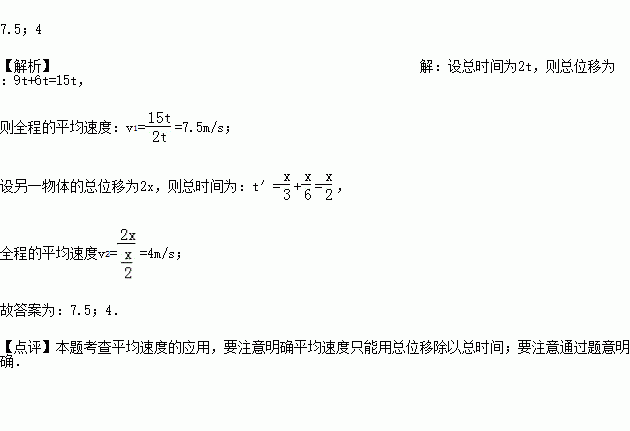 一物体做同向直线运动,前一半时间以9.0m/s的速度做匀速运动;后一半时间以6.0m/s的速度做匀速运动,则物体的平均速度是 m/s.另一物体也做同向直线运动,前一半路程以3.0m/s的速度做匀速运动;后一半路程以6.0m/s的速度做匀速运动,则物体的平均速度是 m/s.