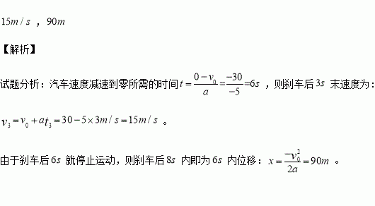 汽车以大小为30m/s的速度做匀速直线运动,刹车后加速度的大小为5m/s2,那么刹车后3s末汽车的速度是多大?刹车后8s内汽车的位移又是多大?