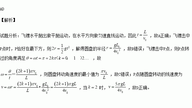 如图所示,一位同学玩飞镖游戏。 圆盘最上端有一点P,飞镖抛出时与P等高,且距离P点为L。当飞镖以初速度