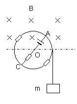 如图所示,一个边缘带有凹槽的金属圆环,沿其直径装有一根长2L的金属杆AC,可绕通过圆环中心的水平轴O转动。将一根质量不计的长绳一端固定于槽内并将绳绕于圆环槽内,绳子的另一端吊了一个质量为m的物体。圆环的一半处在磁感应强度为B,方向垂直环面向里的匀强磁场中。现将物体由静止释放,若金属圆环和金属杆单位长度的电阻均为R。忽略所有摩擦和空气阻力.