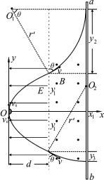 设沿y轴正方向发射的电子打到感光板上时在磁场中运动沿y轴的偏转量为y2,沿y轴负方向发射的电子打到感光板上时在磁场中运动沿y轴的偏转量为y3,由图中几何关系得: