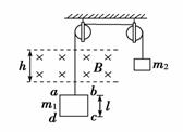 如图所示,线圈abcd每边长l=0.20 m,线圈质量m1=0.10 kg,电阻R=0.10 Ω ,砝码质量m2=0.16 kg.线圈上方的匀强磁场的磁感应强度B=0.5 T,方向垂直线圈平面向里,磁场区域的宽度为h=l=0.20 m.