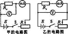 甲、乙两个同学使用完全相同的器材用伏安法测量同一未知电阻Rx的阻值,给定器材为:待测电阻Rx;电流表mA(量程5 mA,内阻约为10 Ω);电压表V(量程3 V,内阻约为3000 Ω);最大阻值为1700 Ω的滑动变阻器;电源E(电动势约3 V);开关S、导线若干,甲、乙两个同学的测量数据处理结果分别如图甲、乙所示.