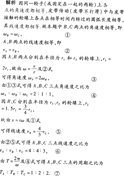 如图所示的皮带传动装置(传动皮带是绷紧的且运动中不打滑)中,主动轮O1的半径为r1,从动轮O2有大小两轮固定在一个轴心O2上,半径分别为r3、r2,已知r3=2r1,r2=1.5r1,A、B、C分别是三个轮边缘上的点,则当整个传动装置正常工作时,A、B、C三点的线速度之比为________;角速度之比为________;周期之比为________.