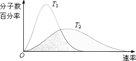 我们知道,气体分子的运动是无规则的,每个分子运动的速率一般是不同的,但大量分子的速率分布却有一定的统计规律.如图所示描绘了某种气体在不同温度下的分子速率分布曲线,则二条曲线分别对应的温度T1和T2的大小关系是