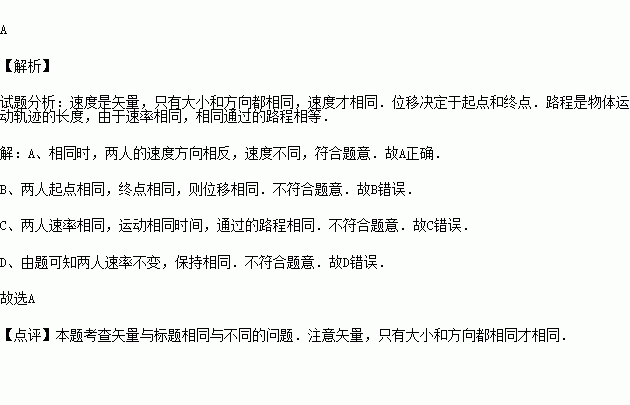 两个人以相同的速率同时从圆形轨道的A点出发,分别沿ABC和ADC行走,如图所示,当他们相遇时不相同的物理量是( )