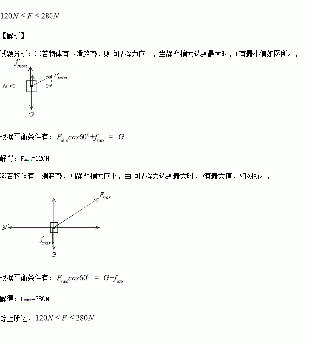 (8分)如图所示,重为100N的物体受推力F作用贴于墙面静止,F与墙的夹角θ=600,墙对物体的最大静摩擦力为40N,要使物体保持静止,求推力F的大小范围。