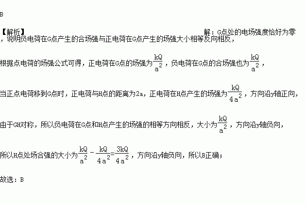 直角坐标系xOy中,M、N两点位于x轴上,G、H两点坐标如图.M、N两点各固定一负点电荷,一电量为Q的正点电荷置于O点时,G点处的电场强度恰好为零.静电力常量用k表示.若将该正点电荷移到G点,则H点处场强的大小和方向分别为( )