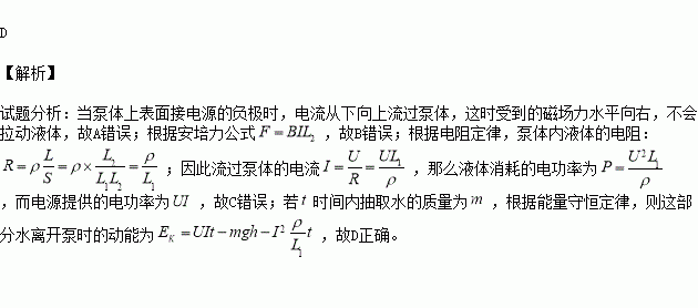 如图为某种电磁泵模型,泵体是长为L1,宽与高均为L2的长方体.泵体处在方向垂直向外、磁感应强度为B的匀强磁场中,泵体的上下表面接电压为U的电源(内阻不计),理想电流表示数为I,若电磁泵和水面高度差为h,液体的电阻率为ρ,在t时间内抽取液体的质量为m,不计液体在流动中和管壁之间的阻力,取重力加速度为g.则( )