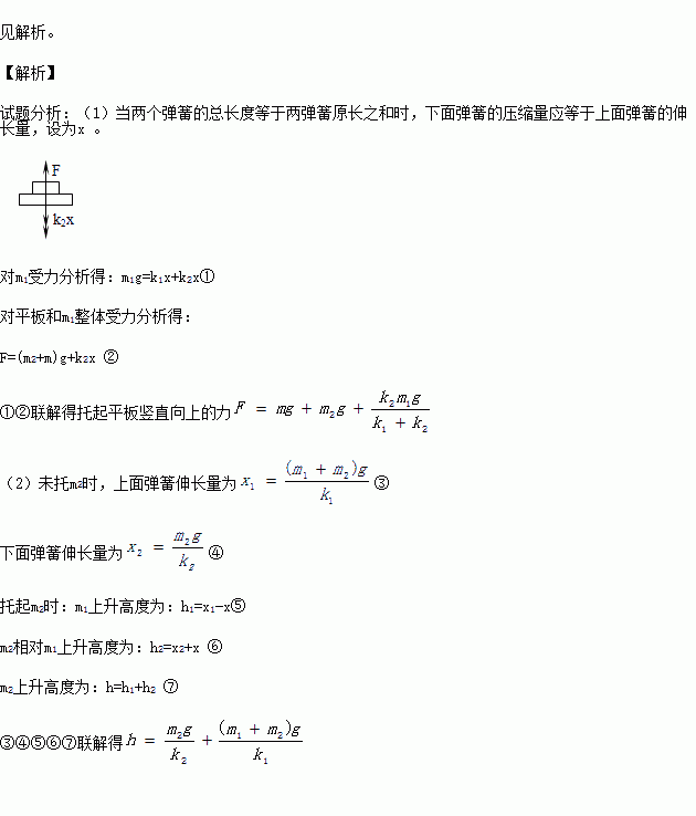 (6分)如图,原长分别为L1和L2,劲度系数分别为k1和k2的轻质弹簧竖直地悬挂在天花板上,两弹簧之间有一质量为m1的物体,最下端挂着质量为m2的另一物体,整个装置处于静止状态。现用一个质量为m的平板把下面的物体竖直地缓慢地向上托起,直到两个弹簧的总长度等于两弹簧原长之和。求: