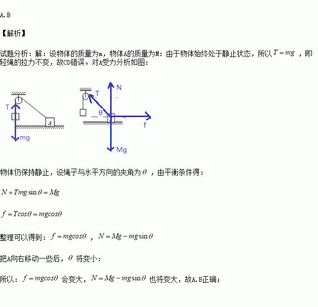 如图所示,放在水平面上的物体A用轻绳通过光滑定滑轮,连接另一个物体,并处于静止。这时A受到地面的弹力为N,摩擦力为f,若把A向右移动一些,并仍静止,则( )