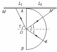 ,直径AB与屏幕MN垂直并接触于A点。激光a以入射角i=30°射入玻璃砖的圆心O,在屏幕MN上出现了两个光斑。画出光路图并求这两个光斑之间的距离L。