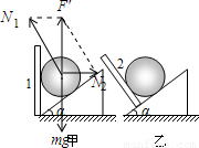 如图所示,倾角为α的斜面体固定在水平地面上,一个质量为m的光滑的小球置于固定的挡板和斜面体之间处于静止状态.甲图中挡板1竖直,乙图中挡板2与斜面垂直.下列关于斜面体对小球的支持力大小和挡板对小球的支持力大小的结论正确的是( )