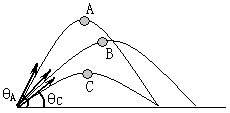 以相同的初速率,不同的抛射角同时抛出三个小球,A、B、C三球在空中的运动轨迹如图所示,下列几句话是正确的是