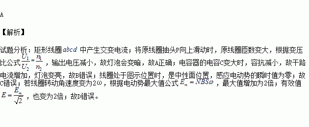 A.将原线圈抽头P向上滑动时,灯泡变暗