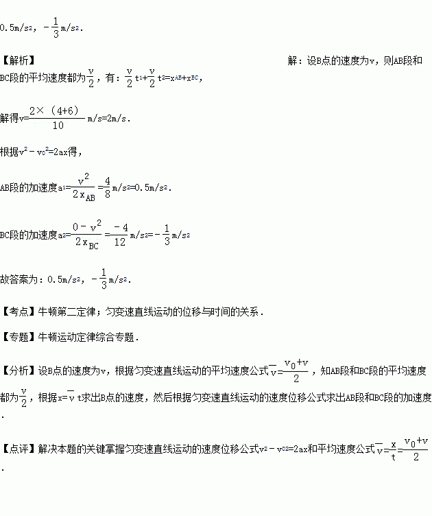 如图所示,物体由静止从A点沿斜面匀加速下滑,随后在水平面上作匀减速运动,最后停止于C点,已知AB=4m,BC=6m,整个运动历时10s,则物体沿AB段运动的加速度a1= m/s2;沿BC运动的加速度 a2= m/s2.