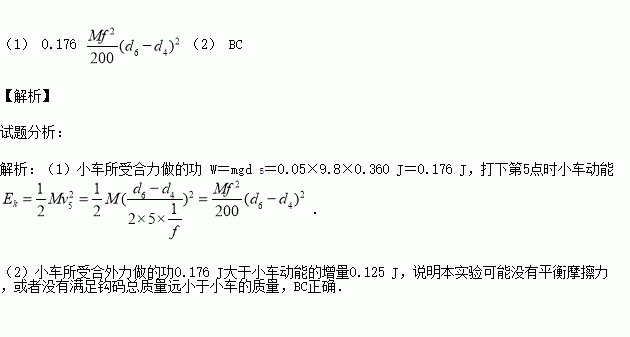 £¨1£©ËûÔÚ¶à´ÎÖØ¸´ÊµÑéµÃµ½µÄÖ½´øÖÐÈ¡³ö×ÔÈÏΪÂúÒâµÄÒ»Ìõ£¬ÈçͼÒÒËùʾ£®°Ñ´òϵĵÚÒ»µã¼Ç×÷0£¬È»ºóÒÀ´ÎÈ¡Èô¸É¸ö¼ÆÊýµã£¬ÏàÁÚ¼ÆÊýµã¼ä»¹ÓÐ4¸öµãδ»³ö£¬ÓÃÀåÃ׿̶ȳ߲âµÃ¸÷¼ÆÊýµãµ½0µã¾àÀë·Ö±ðΪ d 1 £½ 0.041 m £¬ d 2 £½ 0.055 m £¬ d 3 £½ 0.167 m £¬ d 4 £½ 0.256 m £¬ d 5 £½ 0.360 m £¬ d 6 £½ 0.480 m £¬¡Ëû°Ñ¹³ÂëÖØÁ¦£¨µ±µØÖØÁ¦¼ÓËÙ¶È g £½ 9.8 m /s 2 £©×÷ΪС³µËùÊܺÏÁ¦£¬Ëã³ö0µãµ½µÚ5¼ÆÊýµãºÏÁ¦×ö¹¦ W £½__________J£¨½á¹û±£ÁôÈýλÓÐЧÊý×Ö£©£¬ÓÃÕýÈ·µÄ¹«Ê½¼ÆËã´òϵÚ5¼ÆÊýµãʱС³µ¶¯ÄÜE k £½__________£¨ÓÃÏà¹ØÊý¾Ýǰ×ÖĸÁÐʽ£©²¢°Ñ´òϵÚ5µãʱС³µ¶¯ÄÜ×÷ΪС³µ¶¯ÄܵĸıäÁ¿£¬ËãµÃ E k £½0.125 J£®